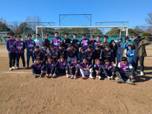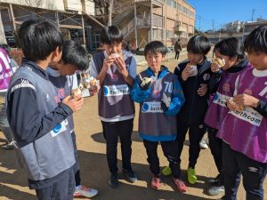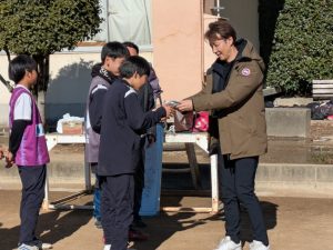 開会式では東春のおもてなし部の3名が司会進行をし、一発芸や東春名物のキラキラをお見せし、和気あいあいとスタートしました。試合はジュニアユースvsアースコムさんで30分1本行った後、全員シャッフルで20分2本やりました。白熱しながらも、珍プレー、好プレーが繰り広げられました。閉会式では大人から貴重なゴールを奪った2人と見学ながらラインマンをたくさんやってくれた選手にMVPが贈られました。